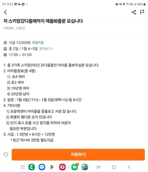 부부들끼리 모여서 여행겸 다녀오는건 이해할 수 있는데 초등학생 둘은 그렇다 쳐도 19년생, 20년생을 맡기는데 시급부터 좀 그렇네요. 초2.초4 아이들이 동생들 본다고 해도 손이 안간다는건 말도 안되고, 6살, 5살 아이들은 조부모님들께 맡기거나 혹은 각각 한 명의 보호자가 붙어야죠. 2시간~3시간 동안 그냥 냉동밥, 냉동국 전자렌지 돌려주기만 하는 조건으로만 두 아이당 시급이 2만5천원 정도로 알고 있는데 (예전에 일 때문에 맘시터 알아봤을 때 그랬어요) 맘시터에서 저 시급으로 봐줄리 없으니 당근에 올린듯 하네요.