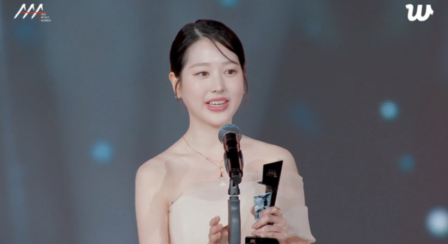 이날 장다아는 티빙 오리지널 시리즈 '피라미드 게임'을 통해 'AAA 2024' 신인상을 거머쥐었다. 시상에는 MC이자 친동생인 장원영이 직접 나서 눈길을 끌었지만, 한 컷에 담긴 두 사람의 모습을 볼 틈도 없이 상을 건넨 채 곧바로 돌아서는 모습을 보여 웃음을 안기기도 했다.
