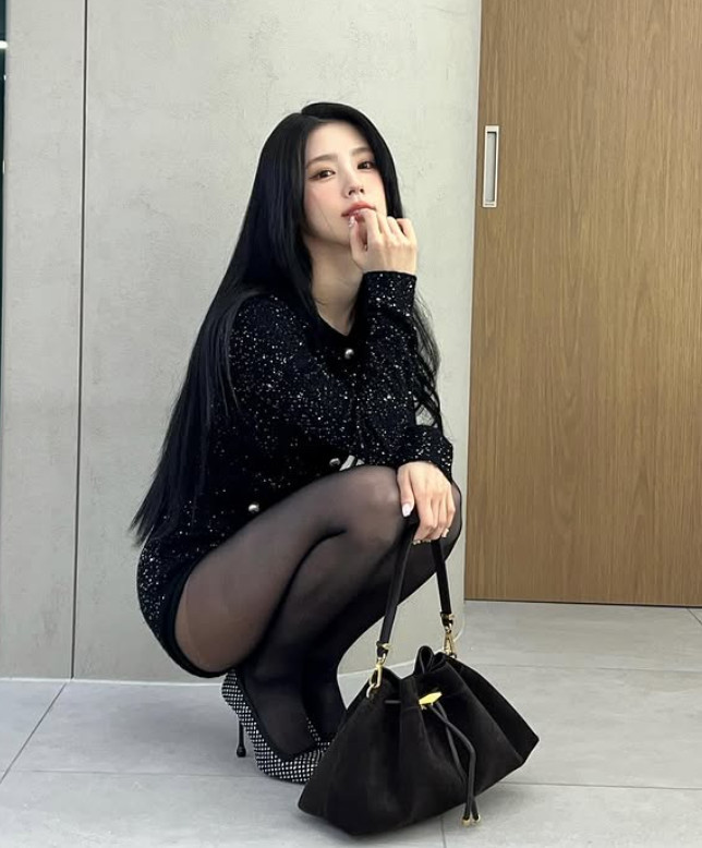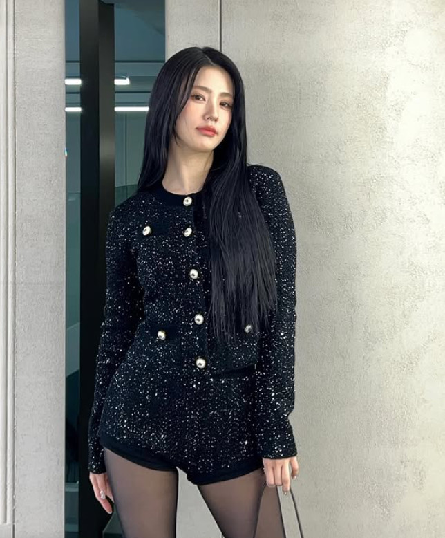 미연 소셜미디어사진 속 미연은 골드 버튼이 포인트인 블랙 트위드 재킷과 마이크로 쇼츠를 착용하고 검은색 스타킹과 하이힐을 착용한 모습이다. 미연은 다리를 강조한 포즈로 늘씬한 각선미를 뽐내 눈길을 끈다.