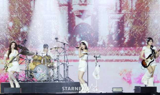 밴드 QWER이 27일 오후 태국 방콕 임팩트 챌린저 홀 1-2(IMPACT Challenger Hall 1-2)에서 진행된 '제 9회 아시아 아티스트 어워즈'(The 9th Asia Artist Awards, 이하 'AAA 2024')'에 참석해 멋진 무대를 선보이고 있다. 2024.12.27 /사진=김창현 chmt@이들은 'AAA 2024'에서 올해 연타 흥행에 성공한 '내 이름 맑음'과 '고민 중독'의 겨울 버전을 선보이며 연말 분위기를 물씬 풍겼다. 여기에 QWER만의 청량한 에너지와 완성도 높은 무대 연출이 눈길을 사로잡았다.특히 QWER은 데이식스에 이어 밴드음악의 열풍을 이끄는 차세대 주자로 함께 'AAA 2024' 라인업에 오른 기쁨을 드러냈다. 쵸단은 "데이식스 선배님들의 노래를 평소 자주 듣고 연습하고 그랬는데 함께 큰 시상식에서 함께 무대에 서게 돼서 영광스럽다. 멋있는 모습 보여드리기 위해 열심히 노력했다"고 밝혔다.