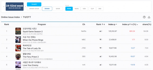 K-콘텐츠 온라인 경쟁력 분석 기관인 굿데이터코퍼레이션이 발표한 12월 4주차 TV-OTT 드라마 화제성 조사에서 넷플릭스의 '오징어게임 시즌2'가 공개 첫 주에 1위에 올랐다.
