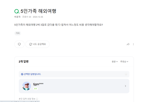 잠들기전 갑자기 생각난 26일 지식인 5인가족 해외여행 문의하셧던거