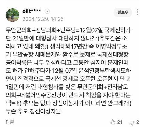 대통령 탄핵되자마자 4일 후에 민주당에서 전문가들의 만류에도 불구하고 국제선 강행해서 사고난거잖아 좌경화된 지상파뉴스에선 안나오던데 주어가 우파로 바꼈으면 개 ㅈㄹ떨었을거아님?