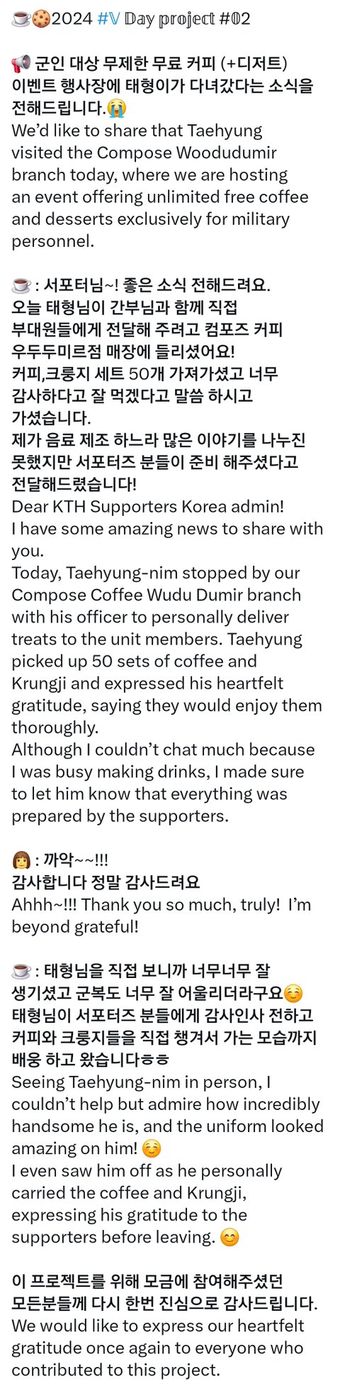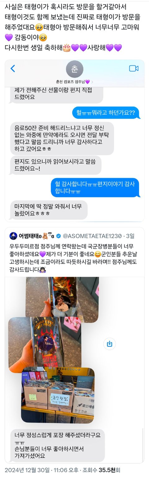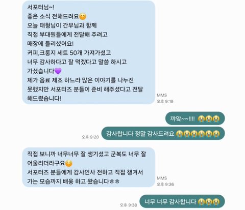 어썸태태님도 같은 지점에 군인들 대상으로 핫팩이벤트 했었는데 혹시나 싶어서 맡겼던 편지도 태형이한테 챙겨주셨나봐 마음이 잘 전달됐을것 같음