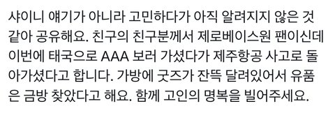 제베원 팬인 제로즈랑 마크 팬이던 시즈니 분도 AAA보고 무안공항으로 오는 제주항공 사고 여객기 탑승하셨다가 돌아가셨대… 아 마음아파