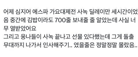 에스파…ㅋㅌㅋㅌㅋ 김밥이라도 먹지녹음본은 좀 억까인 거 알겠는데 돌출무대에서 인사해주기가 깜짝선물이라는 건 너무 스스로 신격화하는 거 아님ㅠㅠㅜㅋㅌㅋㅌㅋㅋ공수치 내가 다 쪽팔림