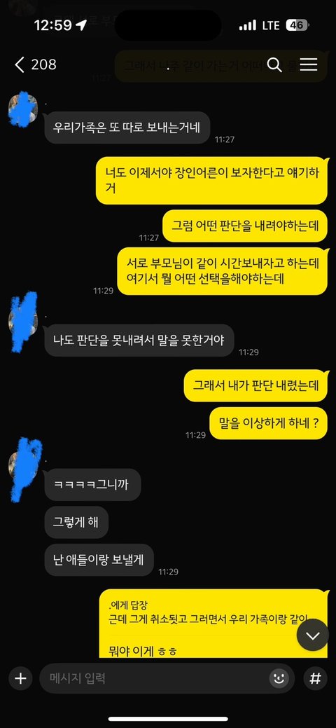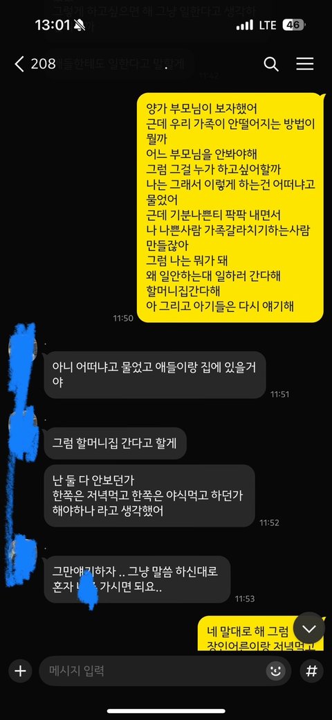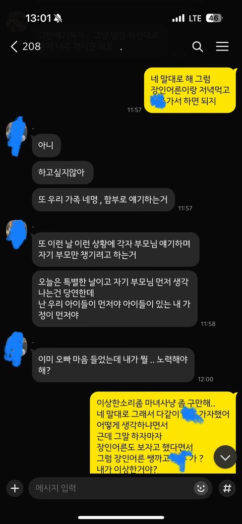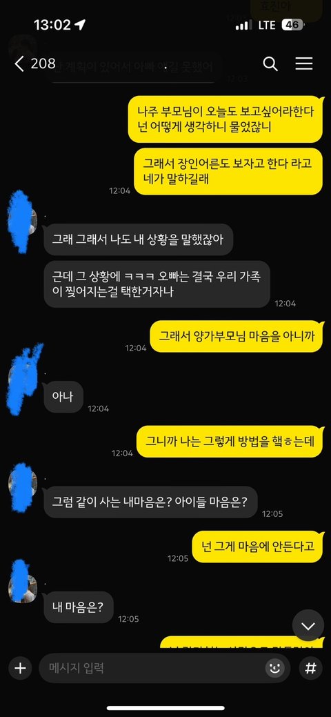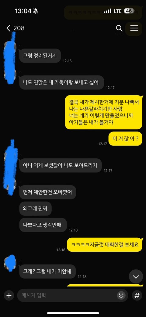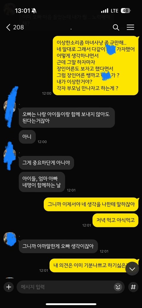 바로 어제 (12.30) 저의 가족 관계는 부모님과 밑으로 남동생 한 명이 있는데오래 교제하던 여자친구와 공식적으로 결혼 하겠다. 식은 이 날짜로 잡았습니다하는 날이라 저만(4살2살 아이들도 함께) 본가 집에 내려가 저녁을 먹고 왔습니다동생여자친구도 있는 자리라 재결합 이후 부모님도 아직 정식으로 뵙지 않아서무거운 분위기를 만들고 싶지 않아서 저만 갔습니다마침 아버지께서 12월31일에 제가 모처럼 일을 쉬니다시 본가 내려와서 저희 가족 다 같이얼굴 한번 보면 어떻겠냐 라는 제안을 하셨고(동생여자친구도 오늘(12.31) 본인가족들과 시간 보내려 집으로 갑니다)저도 일단 알겠습니다 하고 집으로 돌아와 오늘(12.31) 출근 하였습니다그래서 오늘 오전에 와이프한테 연락을 했지요'아버지께서 오늘도 오면 좋겠다 넌 어떻게 하고 싶어?'라고 하니 장인어른도 오늘 보고싶다 하신다 라고 답장이 오더라구요그래서 양가아버지께서 보자고 하는데 어느 한쪽은 못 볼 거 같아서저희 본가는 40km 떨어진 다른 지역이고 처가댁은 같은 동네입니다내일이 휴무라 당연히 어느 부모님을 만나건 술을 먹어야 하는 상황이기에제가 먼저 제안을 했지요 와이프한테"나는 본가집으로 가고 너는 장인어른 만나라아기들은 누가 데리고 있을지 퇴근하고 얘기하자"라고 했더니 그때부터 싸움이 시작 되었습니다-카톡 내용 봐주세요 어떻게 해야 할까요-