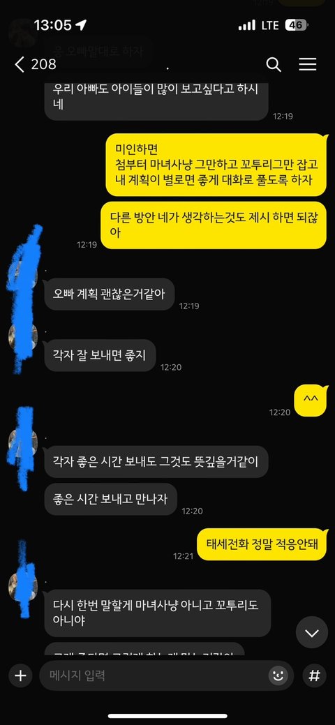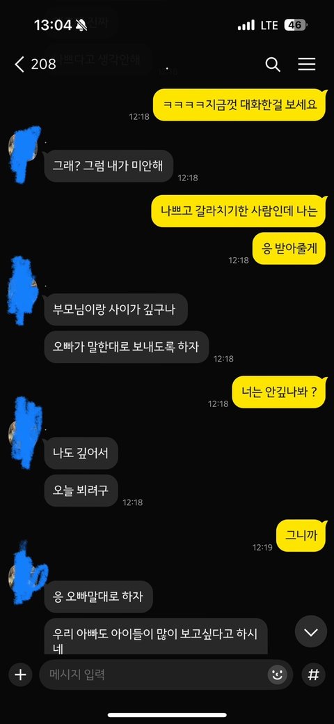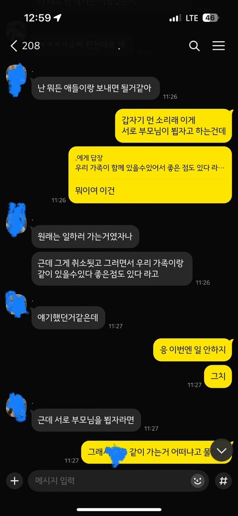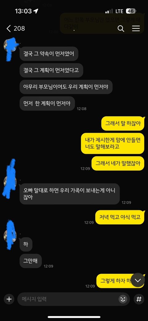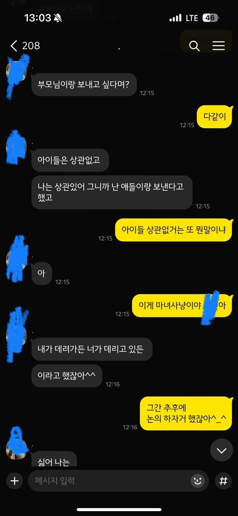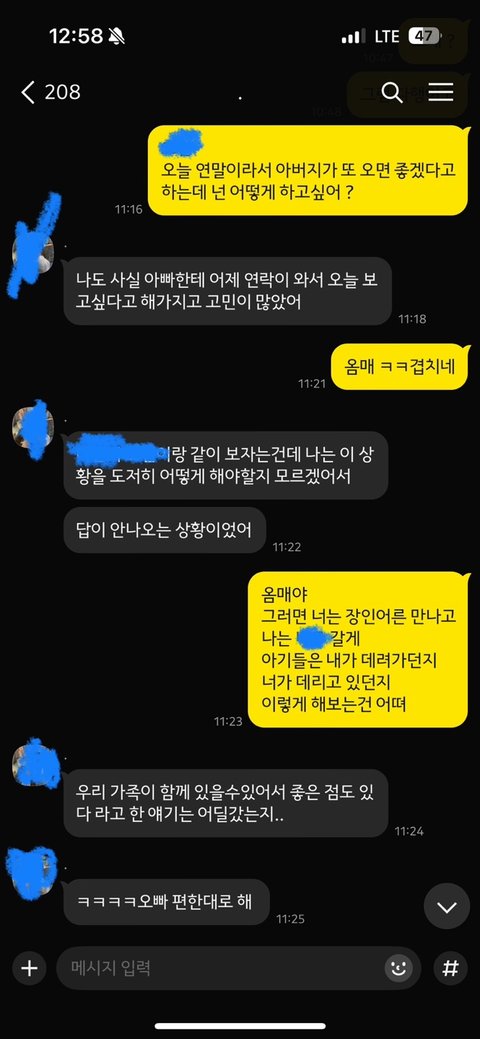 바로 어제 (12.30) 저의 가족 관계는 부모님과 밑으로 남동생 한 명이 있는데오래 교제하던 여자친구와 공식적으로 결혼 하겠다. 식은 이 날짜로 잡았습니다하는 날이라 저만(4살2살 아이들도 함께) 본가 집에 내려가 저녁을 먹고 왔습니다동생여자친구도 있는 자리라 재결합 이후 부모님도 아직 정식으로 뵙지 않아서무거운 분위기를 만들고 싶지 않아서 저만 갔습니다마침 아버지께서 12월31일에 제가 모처럼 일을 쉬니다시 본가 내려와서 저희 가족 다 같이얼굴 한번 보면 어떻겠냐 라는 제안을 하셨고(동생여자친구도 오늘(12.31) 본인가족들과 시간 보내려 집으로 갑니다)저도 일단 알겠습니다 하고 집으로 돌아와 오늘(12.31) 출근 하였습니다그래서 오늘 오전에 와이프한테 연락을 했지요'아버지께서 오늘도 오면 좋겠다 넌 어떻게 하고 싶어?'라고 하니 장인어른도 오늘 보고싶다 하신다 라고 답장이 오더라구요그래서 양가아버지께서 보자고 하는데 어느 한쪽은 못 볼 거 같아서저희 본가는 40km 떨어진 다른 지역이고 처가댁은 같은 동네입니다내일이 휴무라 당연히 어느 부모님을 만나건 술을 먹어야 하는 상황이기에제가 먼저 제안을 했지요 와이프한테"나는 본가집으로 가고 너는 장인어른 만나라아기들은 누가 데리고 있을지 퇴근하고 얘기하자"라고 했더니 그때부터 싸움이 시작 되었습니다-카톡 내용 봐주세요 어떻게 해야 할까요-