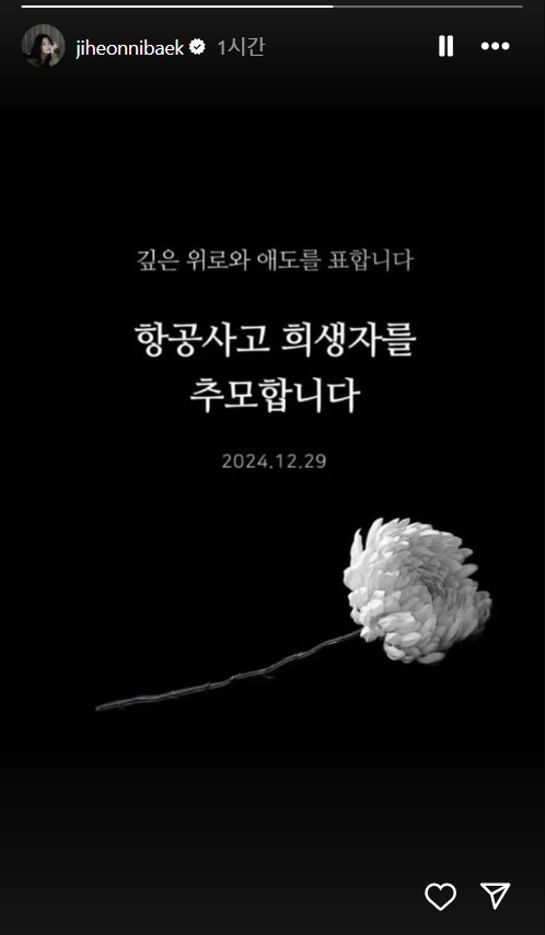 31일 백지헌은 개인 인스타그램을 통해 한 장의 이미지를 게재했다. 이미지에는 국화꽃 한 송이와 함께 “깊은 위로와 애도를 표합니다. 항공사고 희생자를 추모합니다”라는 글귀가 적혀있다.