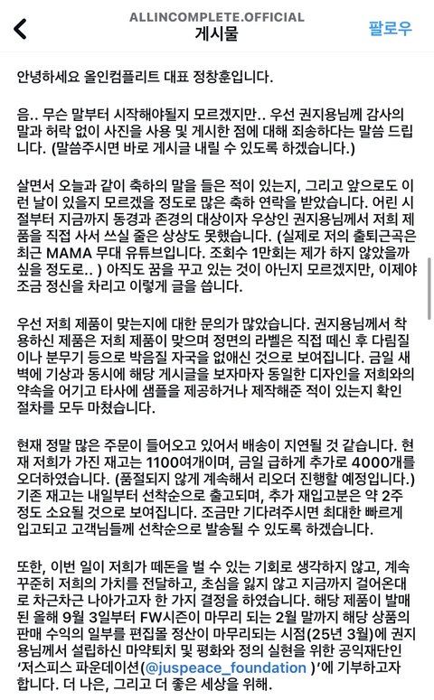 감사한 마음으로 수익정산이 되는 대로 지디가 설립한 마약퇴치재단에 기부를 하겠다고 뜻을 밝히셨음