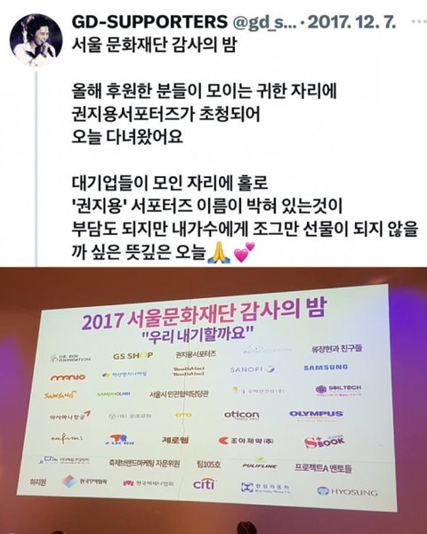 권지용 서포터즈가 기부를 얼마나 많이 했냐면 서울문화재단 고액기부자 감사의 밤에 대기업들 사이에 거의 유일하게 일반인으로 참석했을 정도임