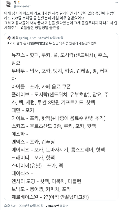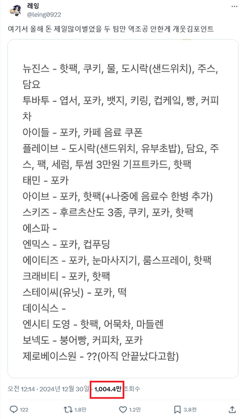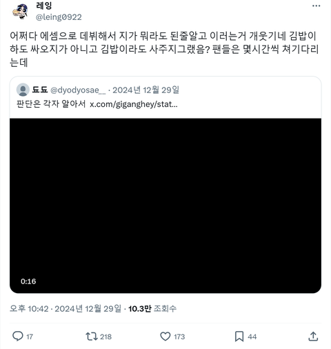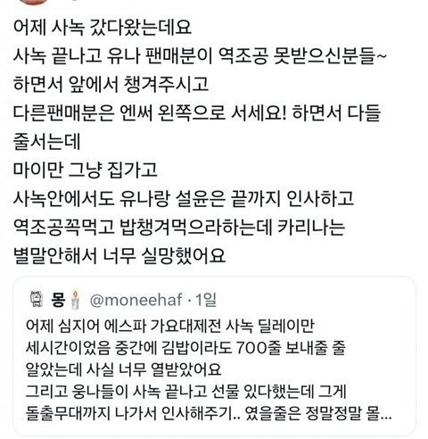 먹금하던 마이들도 저 글에 긁혀서 속상하다는 인용 달았다가 이것도 조회수 2천만 터져서 저 글 인용보면 그냥 개판임 역조공때문에 속상한 마이들이랑 에스파가 팬들을 알기를 우습게 안다고 에스파 까는 사람들로 그냥 지옥임 그 인용들도 죄다 조회수 수십만 백만단위