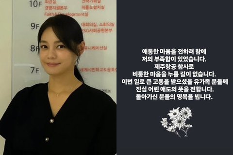 이어 “제주항공 참사로 비통한 마음을 누를 길이 없습니다. 이번 일로 큰 고통을 받으셨을 유가족 분들께 진심 어린 애도의 뜻을 전합니다. 돌아가신 분들의 명복을 빕니다”라고 전했다.
