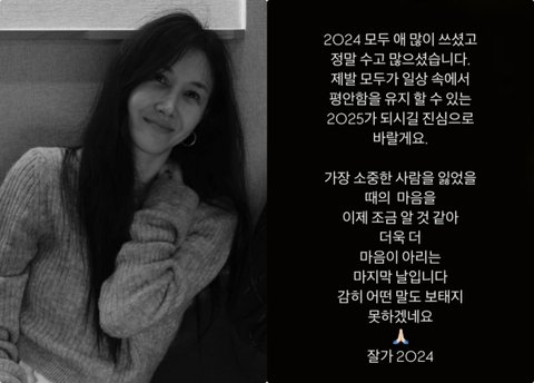 이어 "가장 소중한 사람을 잃었을 때의 마음을 이제 조금 알 것 같아 더욱 더 마음이 아리는 마지막 날"이라며 "감히 어떤 말도 보태지 못하겠네요. 잘가 2024"라고 전했다.