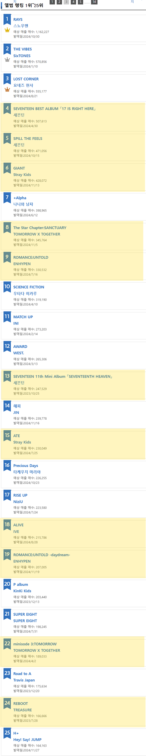 세븐틴, 스키즈, 투바투, 엔하이픈, 아이브, 트레저, 니쥬, 트와이스, 르세라핌, 에스파, 뉴진스, 아일릿