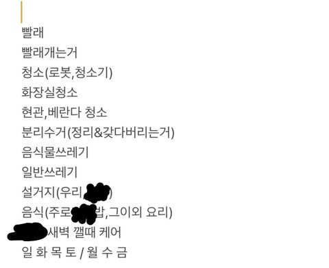 사진은 제가 적어본 나눠서 할 집안일이고, 검은색으로 가린건 아기 이름입니다.