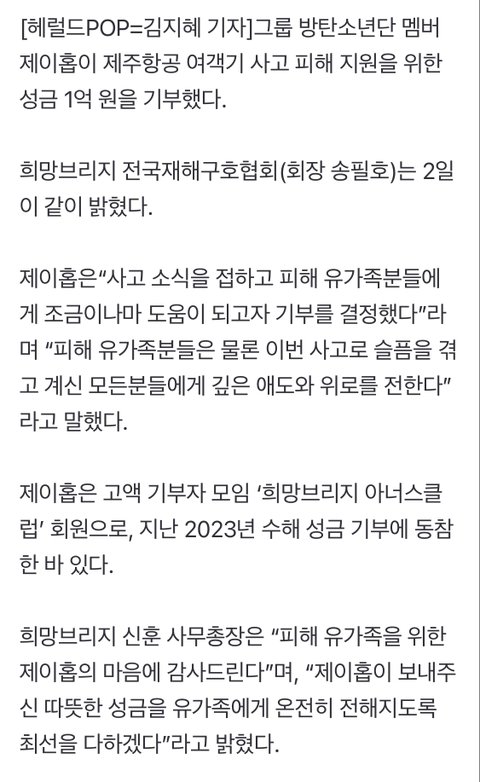 호비 항공참사 유가족에 1억 기부했대