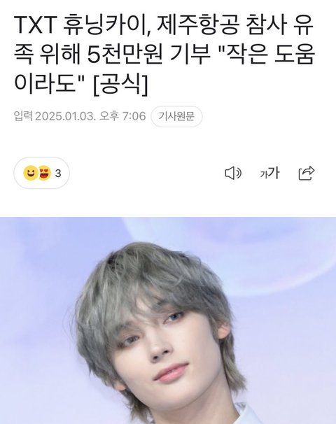 TXT 휴닝카이, 제주항공 참사 유족 위해 5천만원 기부 "작은 도움이라도"