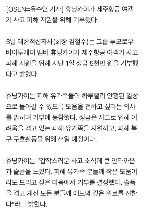 휴닝카이는 “갑작스러운 사고 소식에 큰 안타까움과 슬픔을 느꼈다. 피해 유가족 분들께 작은 도움이라도 드리고 싶은 마음에서 기부를 결정했다. 슬픔을 겪고 계신 모든 분들께 애도와 깊은 위로를 전한다”라고 밝혔다.
