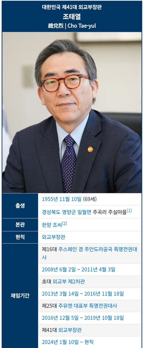 (사진2 설명) 조태열(趙兌烈, Cho Tae-yul) 대한민국 제41대 외교부장관 <NAVER 나무위키>