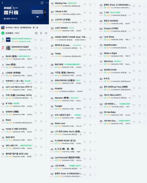 QQ뮤직 급상승 Hot100 중 지드래곤 및 빅뱅 50곡 차트인