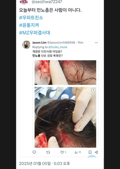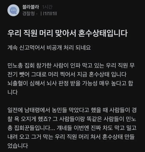 한남동 관저 앞 민노총 시위에서 맞은 경찰