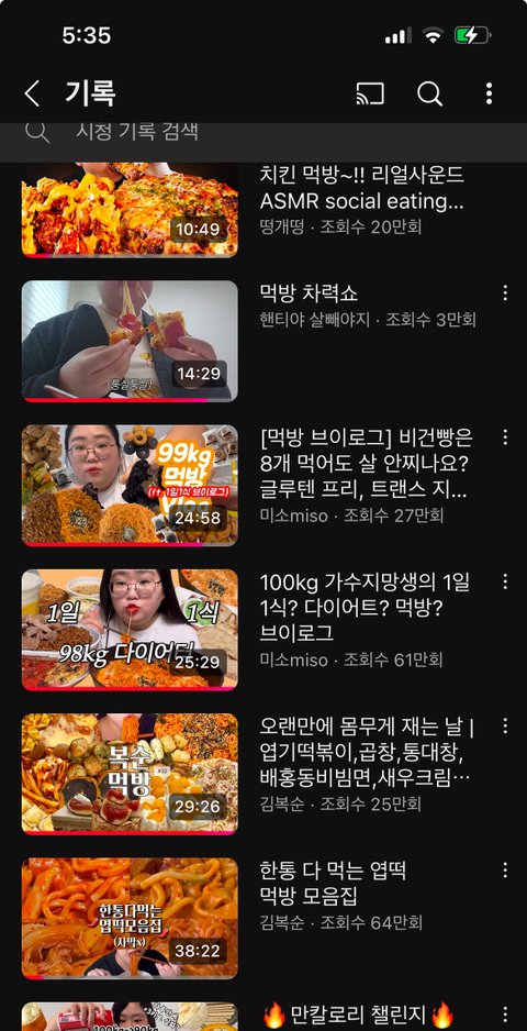 유튜브 시청기록 꼬라지 봐봐 나원래 먹방 왜보는지 이해 못했는데 너무 배고파사 보게됨