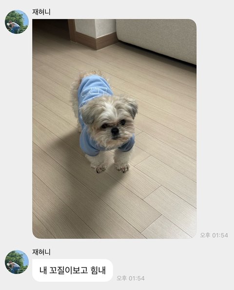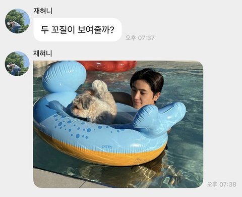 '두 꼬질이'라고 하면서 본인의 최애인 다롱이랑 본인 사진을 보냄