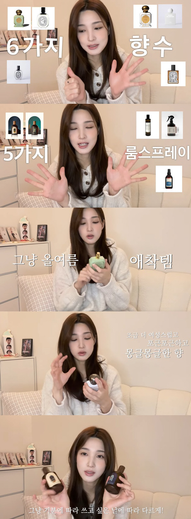 이어 "제가 가진 향수가 15개 정도 된다. 그중에 정말 좋아하고 애용하는 향수 6개를 보여드리겠다. 또 집에서 자주 뿌리는 룸스프레이는 5개 정도 된다"라고 전했다.