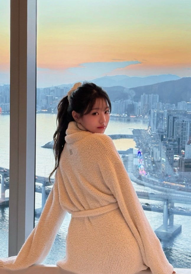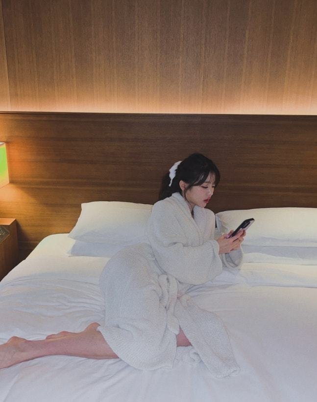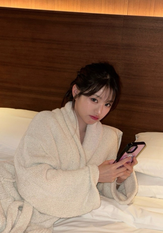 사진에서 장원영은 호텔방에서 샤워 가운만 입고 여러 포즈를 취하고 있다.