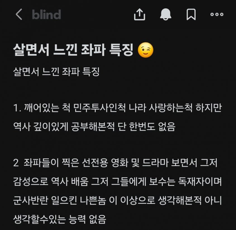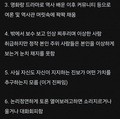 1. 진보들 나라 사랑하는 거 맞음 2. 영화 드라마 사실 기반인거 맞음. 개인의 삶을 파탄낸 보수는 그들이 대의가 있을지언정 역사적으로 나쁜놈들 맞음. 3. 사실기반 영화와 드라마 만든 사람들과 투자자들이 바보는 아님. 4. 2025년 현재 30대 중반 이상에서는 보수보다는 진보를 더 멀쩡하게 보는 건 맞음. 그 아래는 모르겠음. 5. 근거가 부족함. 누구랑 직접 얘기해본건지? 슬슬 폄하로 감. 6. 개소리로 마무리. 실제 학교나 직장 지인들하고 토론이나 해본건지 뇌피셜에 사는 찐따인지 모르겠음. 나도 보수쪽이지만 이런 비난/감정섞인 글 퍼나르는 사람도 문제 있어보임.