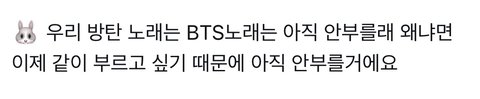궁금한게 정구기 글보고 단체 안한다는 생각을 왜한거지 개웃기네 어떠한 껀덕지도 없는데 라이브도 안봤나봄 방탄노래는 다같이 부른다고 했는데 아ㅋㅋㅋㅋㅋㅋㅋㅋ
