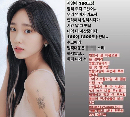 앞서 2023년 김지영의 전 남자친구인 래퍼 에이칠로는 김지영이 교제 중에 돈을 빌리고 갚지 않았다고 폭로했다. 또한 김지영이 고양이를 데려와 놓고 파양비를 보내줄 테니 알아서 하라고 말한 뒤 에이칠로 부모님이 잡아준 자취방에서 나갔다고도 주장했다. '고등래퍼4' 출신인 래퍼 터치더스카이도 자신 역시 김지영에게 당한 피해자라고 동조했다.이와 관련해 김지영은 "이번 일로 실망과 혼란을 느낄 모든 분께 진심으로 죄송한 마음이다. 기사화된 내용과 이와 관련한 문제는 현재 부모와 법적으로 자문받으며 대응하는 준비 과정에 있다. 다른 진행 사항에 대해선 추후에 다시 전하겠다"고 입장을 전했다.