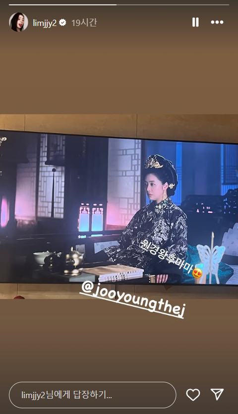 7일 임지연은 자신의 소셜미디어(SNS)에 지난 6일 첫 방송된 드라마 ‘원경’을 본방사수하는 사진을 업로드했다. 임지연은 해당 사진에 배우 차주영의 계정을 태그하고 “원경왕후마마”라고 짧게 작성하며 응원의 메시지를 보냈다.