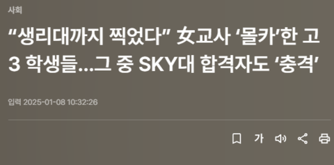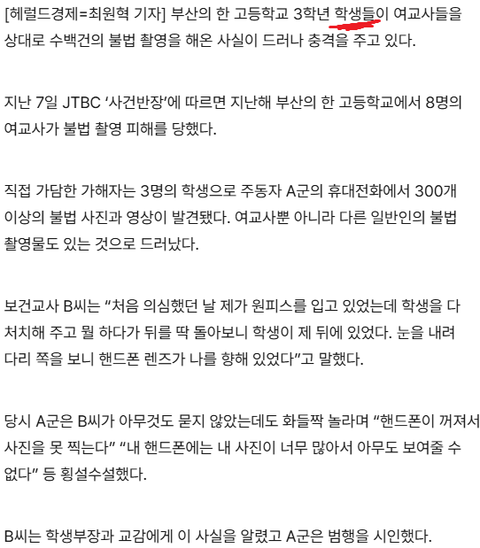 부산 고등학교에서 고3 남자애들이 (한 명이 아님) 여교사 몰카 찍고 심지어 사용한 생리대도 찍었다는데 크게 안 알려진 것 같음
