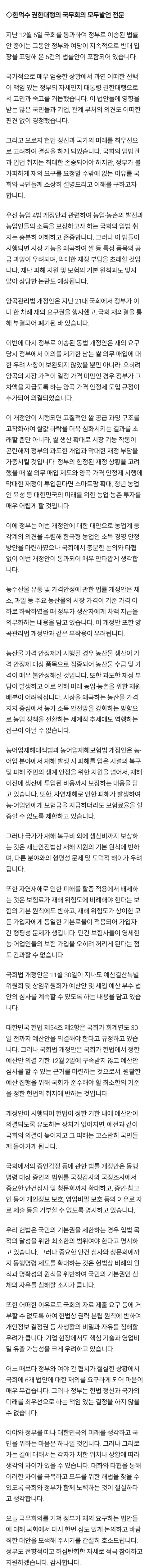 그만좀 탄핵하길 바랍니다. 최상목 서울대법대 수석에 코넬대 경제학과에 일만 잘하는데 한덕수도 3조드는 양곡법 반대에 한우법 반대에 서울대 경제학과 수석 일만잘하는데 양곡법 반대한다고 탄핵. 전정부 국무총리 운동권 임종석보다 백만배 나음. 맨날 200석으로 단독법 만드니 특검법 남발