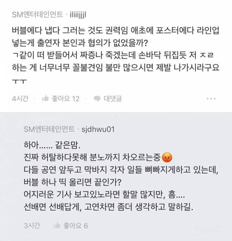 난 저 직원 워딩수준이 경악스러움ㄷㄷㄷ 아무리 억울해도 그렇지 개같이 떠받들어주는데 ㅈㄹ하고 꼴값이라니ㄷㄷ 악플러 악플수준 이제 sm에 저런직원들밖에 안남았나본데ㄷㄷ