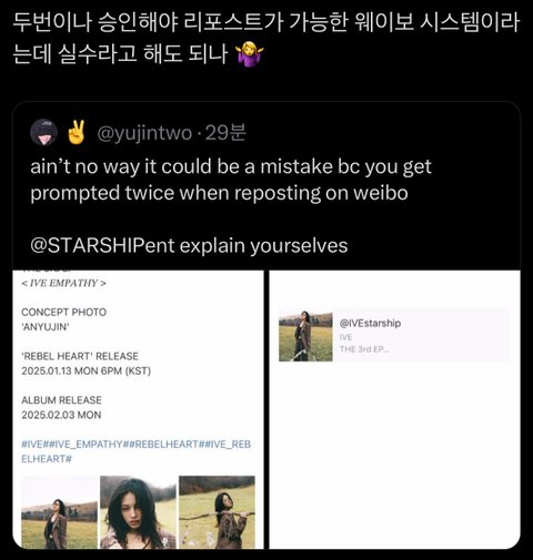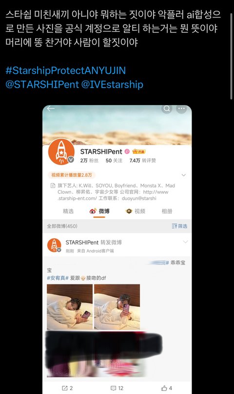 공식 아이브 웨이보 계정 댓글에 타멤 팬들이 대놓고 댓글에 성희롱 딥페짤 올리는데 거기에 스타쉽은 아무 조치 안하고 오히려 그런 딥페짤 알티나 하고 앉음 알티하는 거? 실수가 불가능하다네ㅋㅋㅋ 웨이보는 번거로워서 알림도 두번씩이나 감ㅅㅂ 고소 공지 팬들이 중국어로 박아 둬라 했는데도 개무시하더니 이런 건 다 모니터링하고 보고 있었다는 게 조카 어이털림