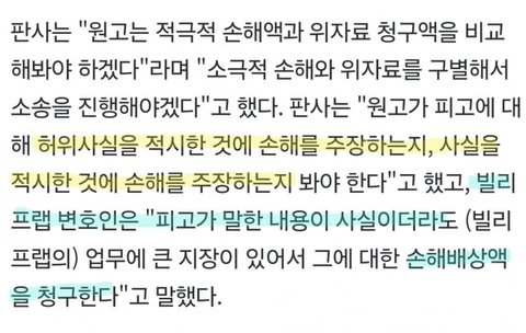 판사는 "원고는 적극적 손해액과 위자료 청구액을 비교해봐야 하겠다"라며 "소극적 손해와 위자료를 구별해서 소송을 진행해야겠다"고 했다. 판사는 "원고가 피고에 대해 허위사실을 적시한 것에 손해를 주장하는지, 사실을 적시한 것에 손해를 주장하는지 봐야 한다"고 했고, 빌리프랩 변호인은 "피고가 말한 내용이 사실이더라도 (빌리프랩의) 업무에 큰 지장이 있어서 그에 대한 손해배상액을 청구한다"고 말했다.
