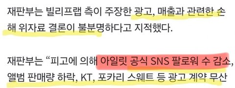 또 판사는 "원고는 뉴진스도 그렇게 보면 TLC, SES 등 다른 비슷한 걸그룹이 많다고 했다. 피고의 행위는 형법상 허위 발언을 유포한 불법 행위라고 했다. 손배소 범위에 대해선 아일릿이 SNS 팔로워 수가 줄었고, 앨범 성적이 하락했고, 광고 계약이 무산됐으며, 모든 걸 감안해 20억 원의 지불을 원했다"고 말했다.
