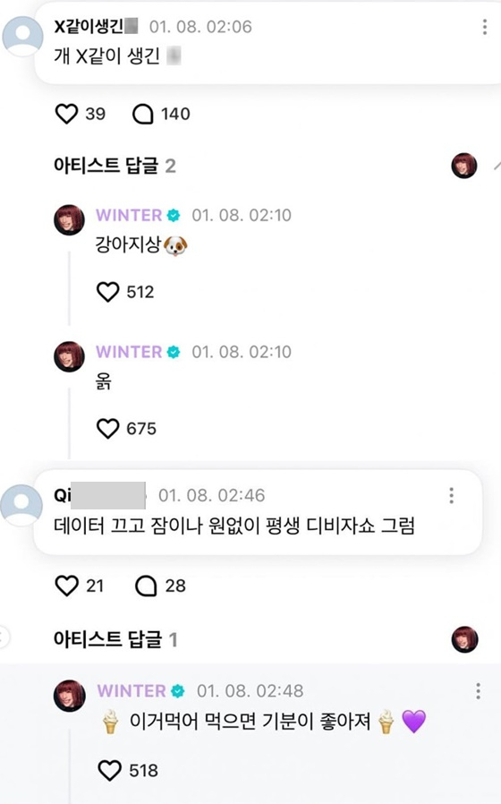 "데이터 끄고 잠이나 원 없이 평생 디비 자라(누워 자라) 그럼"이라는 악플에 윈터는 "이거 먹어. 먹으면 기분이 좋아져"라며 아이스크림 이모티콘으로 달래기도 했다.