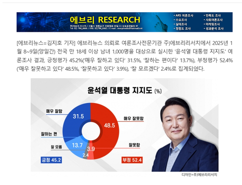[에브리리서치 여론조사] 1월 둘째 주 윤석열 대통령 지지도 '긍정 45.2% vs 부정 52.4%' - 에브리뉴스 EveryNews