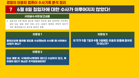 7) 이게 다가 아닙니다. 5월 7일, 6월 3일 및 6월 8일에 이윤희 원룸에 몰래 들어가 이윤희의 컴퓨터를 사용한 자에 대한 수사를 제대로 하지 않습니다.