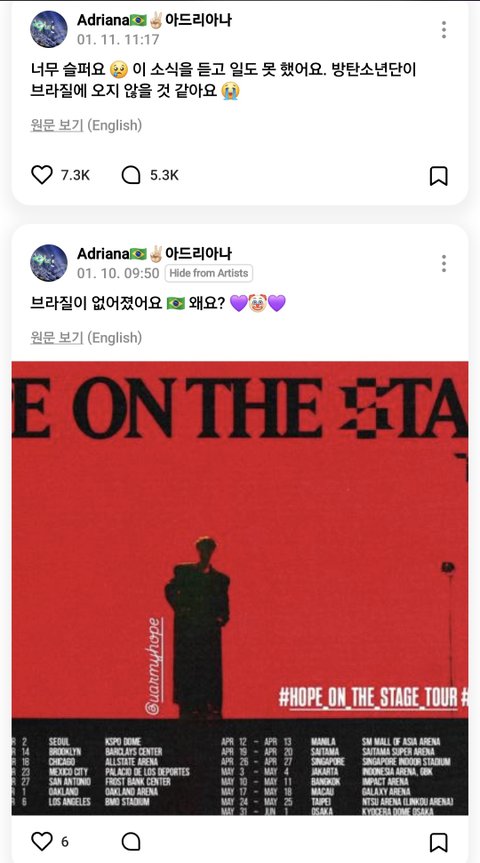 브라질 아미들 수도 많고 엄청 열정적이던데ㅠㅠ 시간때메 갈 수 있는 나라가 한정되어 있어서 다들 아쉽겠다