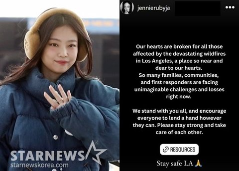 이와 함께 제니는 LA 화재 피해자를 위한 구호품 빛 숙박시설 등 정보가 적힌 링크를 첨부했다.