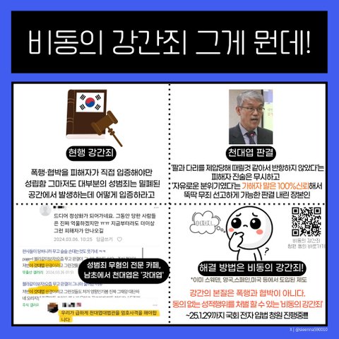 저는 오로지 간절한 바람 하나입니다..비동의 강간죄 국회 입법되어.. 서울이든 부산이든.. 우리나라 어디서는 다시는 저같은 피해자 안나오게..법이 피해자와 가해자에 기울어진 운동장을 조성하지않고, 민주주의 원칙따라 똑바로 기능하여 상식과 법이 제대로 된 나라에서 안전하게 살 수 있도록 많은 서명과 널리 알려주시길 바랍니다!