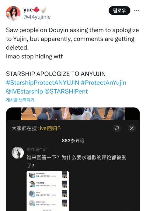 저건 진짜 ㄹㅈㄷ네 ㅋㅋㅋㅋ도우인에 안유진 딥페이크 사진들이랑 악플달리는 건 댓글창 안 닫고 1년 방치하던데 안유진한테 같은 사이트에 사과하라는 댓글들은 빛삭 중이라네 저건 좀 너무하다 걍 사과 빨리하고 수습을 하겠다 차라리..자기네들이 컴백 때 똥 뿌렸으면서 아이브가 뭔 잘못이 있다고 열심히 준비했을건데 ㅠ 딥페이크유포 국가에서 명시한 명백한 범죄인데 실수였다고 해당직원 자르고 안유진한테 사과하는 게 당연한 수순인데 몇일을 병크ing사태로 만들어놓고 이정도면 실수가 아니라고 고의라고 인정하는 격..