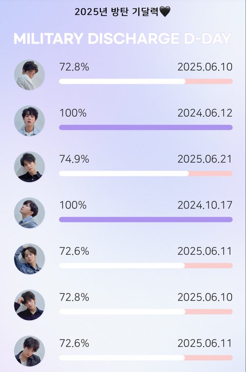 멤버가 일곱 게다가 전원 한국인인 그룹이 군백기가 2년 반밖에 안되는 거 다시 생각해도 ㅈㄴ 자랑스러움 난 체감상 1,2월은 걍 순삭이던데 정신 차려보면 100일 카운트 세고 있을 듯