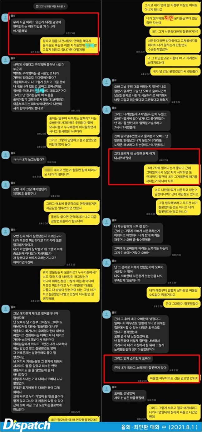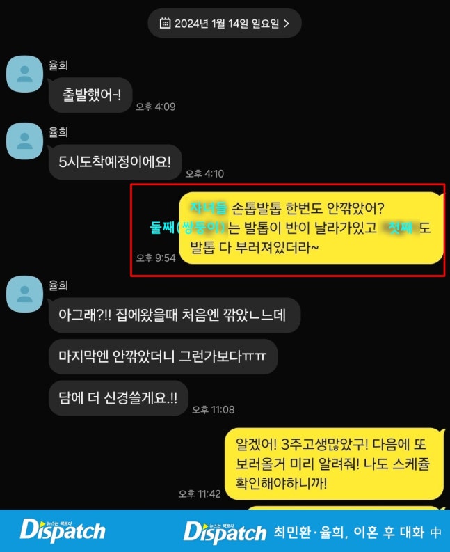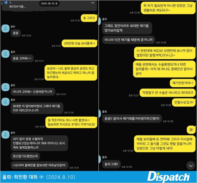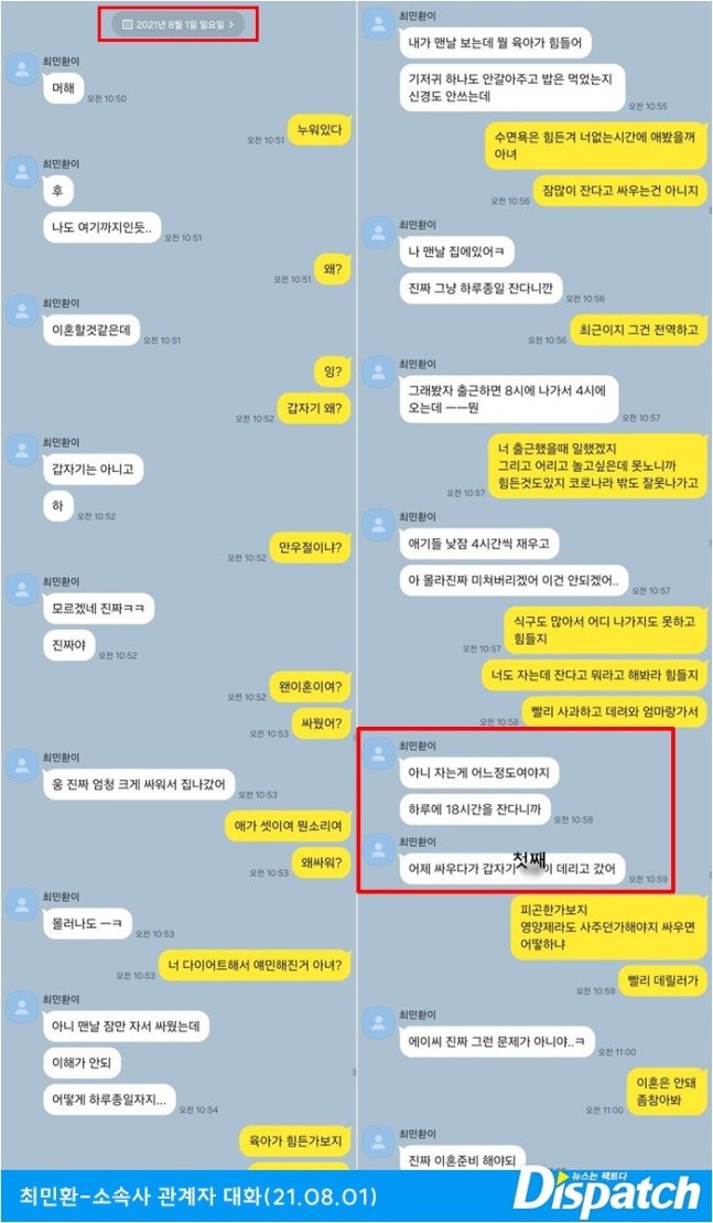 율희는 그날 새벽, 가출을 했다. 첫째를 데리고 갔다. 그리고 10일 동안 친정에 머물렀다. '디스패치'는 두 사람의 8월 10일 카톡을 입수했다. 다툼의 이유를 확인할 수 있었다.