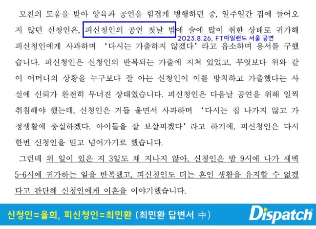 “우리가 이혼 협의를 할 때, 그 문제는 나오지도 않았습니다. 생활 방식의 간극을 좁히지 못해서였죠. 갑자기 업소 문제를 파경 원인으로 끄집어내 위자료를 요구하는지...” (최민환)